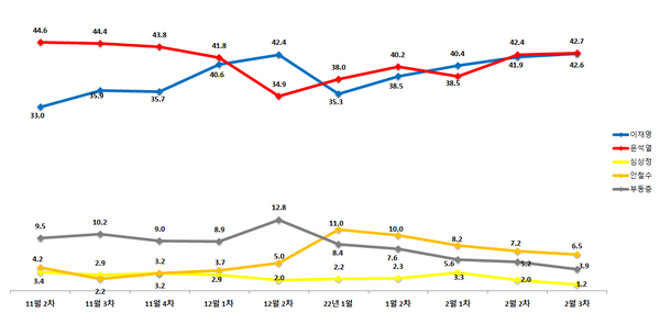 한길리서치가 폴리뉴스 의뢰로 지난 19∼21일 전국 성인 남녀 1027명을 대상으로 조사한 결과(신뢰수준 95%에 표본오차 ±3.1%포인트), 이 후보가 42.6% 윤 후보가 42.7%로 집계됐다. 두 후보의 격차는 0.1%포인트이다.
