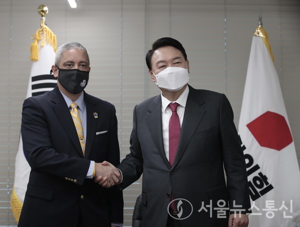 【서울 = 서울뉴스통신】 이민희 기자 =ㄹ윤석열 대통령 당선인이 11일 오후 서울 여의도 국민의힘 당사 내 당선인 집무실에서 크리스토퍼 델 코소 주한미국대사대리 접견하며 악수하고 있다./사진=국민의힘 2022.3.11/서울뉴스통신