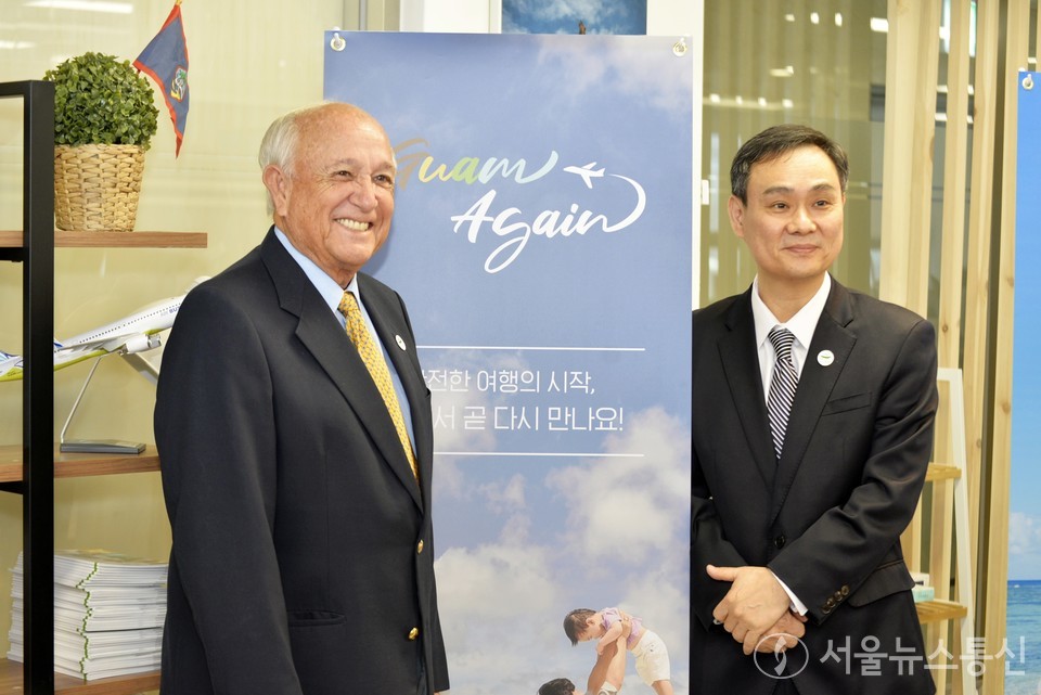 【서울 = 서울뉴스통신】 이민희 기자 =칼 T.C. 구티에레즈 괌정부관광청장(왼쪽)이 4일 오후 경희궁길 소재 괌관광청 한국지사에서 여행업계 전문기자들과 인터뷰를 가진 후 포즈를 취해달라는 요청에 활짝 웃고 있다. (사진 오른쪽)은 괌관광청 한국지사 설립에 큰 역할을 한 은호상 괌정부관광청 한국마켓위원장. 2022.4.5/서울뉴스통신 (사진 = 이민희 기자)