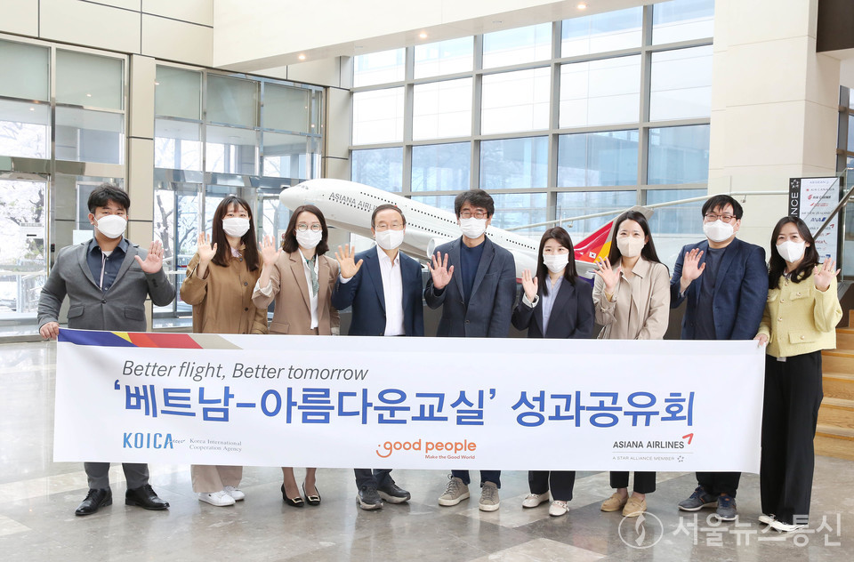 【서울 = 서울뉴스통신】 이민희 기자 =아시아나항공이 12일 오전 서울 강서구 소재 아시아나항공 본사에서 '베트남-아름다운 교실 성과공유회'를 실시했다. 아시아나항공 조영석 상무(왼쪽 다섯번째), 굿피플 강대성 상임이사(왼쪽 네번째), 코이카 전윤수 대리(오른쪽 네번째)와 관계자들이 기념 촬영을 하고 있다. 2022.4.12./서울뉴스통신 (아시아나항공 제공)