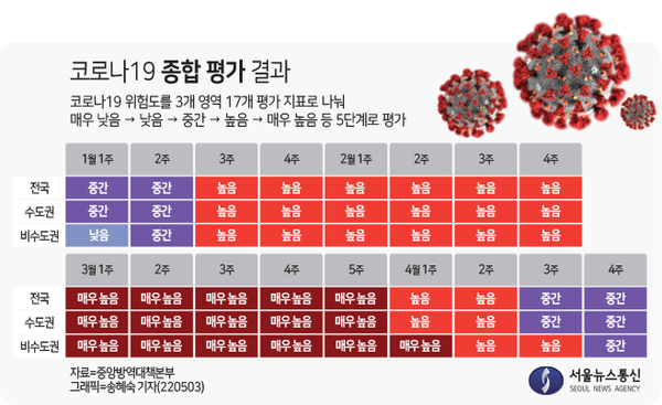 【서울 = 서울뉴스통신】 송혜숙 기자 = 3일 중앙방역대책본부는 '4월 4주 주간 위험도'는 병상가동률이 낮은 수준을 유지하는 상황 및 주간 신규, 위중증 및 사망 확진자의 완만한 감소세를 고려해 전국·수도권·비수도권 모두 '중간' 단계로 평가했다.