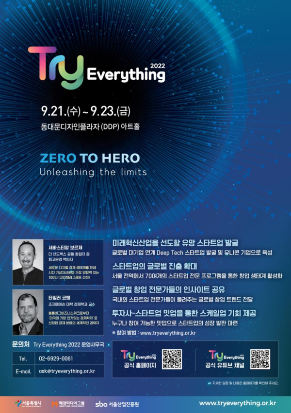 【서울 = 서울뉴스통신】 이민희 기자 =서울시는 글로벌 스타트업 대축제 ‘트라이 에브리싱(Try Everything) 2022’를 21일부터 23일까지 동대문디자인플라자(DDP)에서 개최한다고 밝혔다.