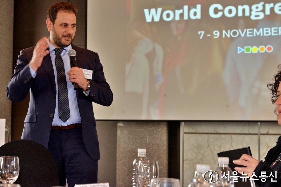 22일 오전 서울 중구 플라자호텔에서 열린 기자간담회에서 바르셀로나 스마스시티 엑스포 월드 콩그레스 우고 발렌티(Ugo Valenti) 사장은 "직접 한국을 방문해 관련 기관 및 기업과의 유대를 강화할 수 있게 되어 영광스럽고 기쁘다. 한국은 의심할 여지 없이 스마트시티 기술의 벤치마크 대상이며, 대도시 속에 적용되는 기술이 우리의 삶을 어떻게 향상시키는지 보여주는 일에 항상 앞장 서 온 나라다"라고 먼저 인사했다.