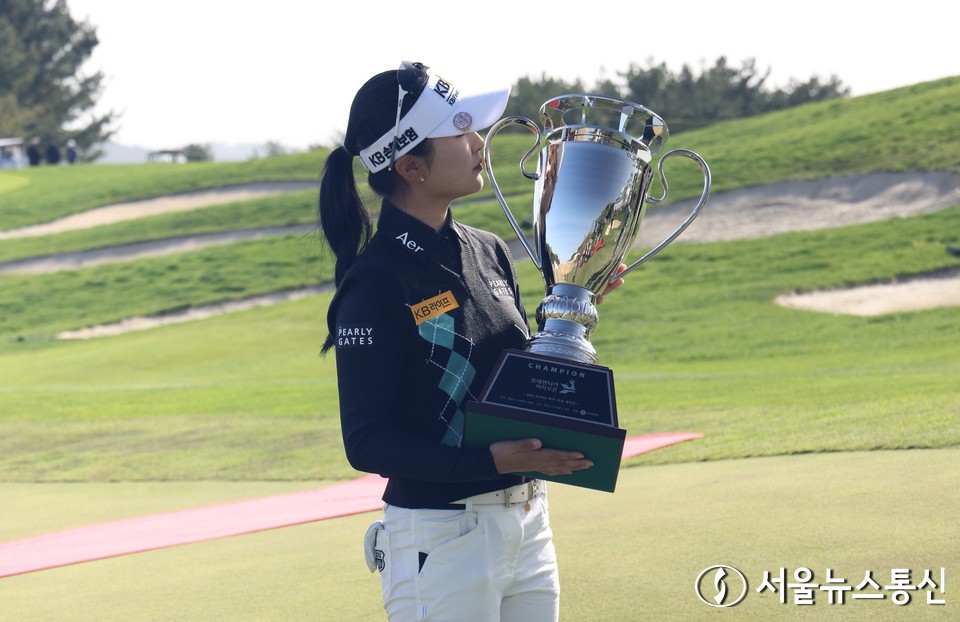 【서귀포(제주) = 서울뉴스통신】 이민희 기자 = 9일 제주 서귀포 롯데스카이힐제주 컨트리클럽에서 펼쳐진 KLPGA 국내 개막전 ‘롯데렌터카 여자오픈’마지막 라운드에서 1999년 KLPGA투어에 신인상 포인트제도가 도입된 후 처음으로 3천 포인트를 넘기며 신인상을 받은 이예원(20,KB금융그룹)이 생애 첫 우승컵을 들어올렸다. 이예원이 우승컵을 안고 기뻐하고 있다. 2023.4.10./서울뉴스통신 (사진 이민희 기자)