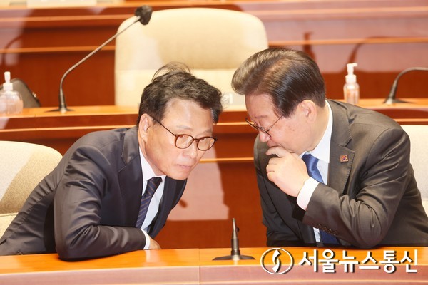 【서울 = 서울뉴스통신】 이민희 기자 =더불어민주당 이재명 대표와 박광온 원내대표가 30일 오후 서울 여의도 국회에서 열린 의원총회에서 이야기를 나누고 있다. 2023.5.30./서울뉴스통신 신현성 기자 snakorea.rc@gmail.com