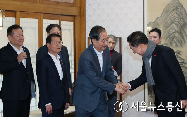 【서울 = 서울뉴스통신】 신현성 기자 =한덕수(좌) 국무총리와 김기현 국민의힘 대표가 3일 오후 서울 종로구 국무총리공관에서 열린 고위당정협의회에 참석해 악수를 나누고 있다. 공동취재사진/2023.12.3