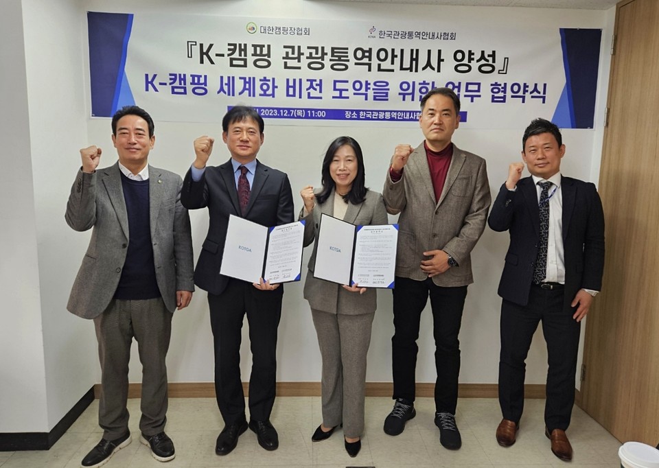 【서울 = 서울뉴스통신】 이민희 기자 = ㈔대한캠핑장협회(회장 김광희)와 ㈔한국관광통역안내사협회(회장 박인숙)는 지난 7일 오전 한국관광통역안내사협회 회의실에서 K-캠핑 세계화 비전 도약을 위한 'K-캠핑관광통역안내사 양성'업무 협약을 체결했다고 밝혔다.