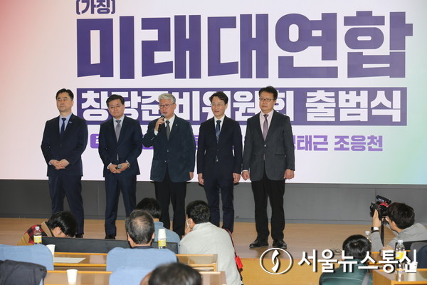 【서울 = 서울뉴스통신】 이민희 기자 =김종민(왼쪽부터), 박원석, 조응천, 이원욱, 정태근 공동추진위원장이 14일 오전 서울 여의도 국회 의원회관에서 열린 미래대연합(가칭) 창당준비위원회 출범식에서 환영사를 하고 있다. 2024.1.14/서울뉴스통신 신현성 기자 snakorea.rc@gmail.com