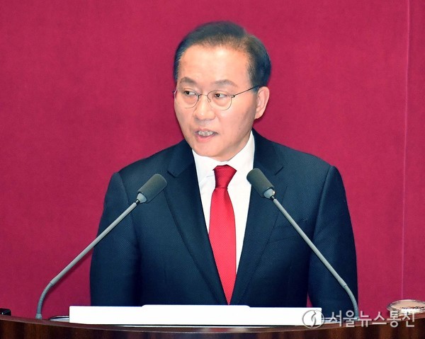 【서울 = 서울뉴스통신】 신현성 기자 =윤재옥 국민의힘 원내대표가 21일 오전 서울 여의도 국회에서 열린 제413회국회(임시회) 3차 본회의에서 교섭단체 대표연설을 하고 있다. 2024.02.21. / 서울뉴스통신 이민희 기자 nimini73@daum.net