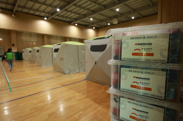 구호물품은 △생수 2만160점 △기업구호키트 420점 △대피소 칸막이 74점 △바닥 매트 74점 등이다. 이번에 지원한 물품은 SK하이닉스, 한국타이어, OB맥주 등의 후원으로 마련됐다. 희망브리지는 이 외에도 현장 상황을 살피며 추가로 지원할 계획이다.