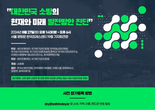 【서울 = 서울뉴스통신】 이민희 기자 = 세이프투데이, 국가위기관리학회, 한국재난관리학회 등이 주최 주관한 제15차 국가위기관리포럼 ‘대한민국 소방의 현재와 미래 발전방안 진단’이 오는 27일 오후 1시~5시30분까지 서울 중구 세종대로 소재 한국언론진흥재단 19층 기자회견장에서 개최된다.