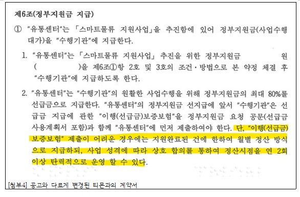중기유는 이 과정에서 중기유 예산인 정부지원금을 떼일 위험을 미리 막도록 계획을 변경해 계약을 맺었다.[첨부4] 기관과 직원들의 책임 소재를 미리 없앤 것이다. 중기유는 티몬과의 협의를 통해 80% 선지급 계획을 ‘월별 사업 완료 건에 대한 후불’로 변경해 계약을 한다. 5월 소상공인 참여업체 모집을 시작해 78곳이 각 60만 원 씩 내고 신청했지만 7월 초 티메프 사태가 터지며 사업이 완료되지 않았고, 중기유는 티몬에 지원금을 전혀 지급하지 않았다.