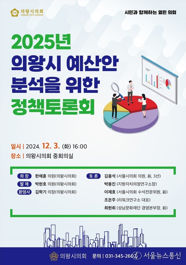 【의왕 = 서울뉴스통신】 성은숙 기자 =의왕시의회(의장 김학기)는 오는 12월 3일 오후 4시 시의회 중회의실에서 「2025년 의왕시 예산안 분석을 위한 정책토론회」를 개최한다.