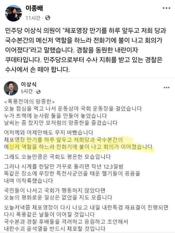 이 의원은 “경찰이 민주당을 위해 불법적으로 대통령을 체포하겠다는 것은 국기문란이자 명백한 불법이다. 따라서 경찰은 수사에서 손을 떼야 한다. 민주당의 수사 지휘를 받아 불법적으로 대통령을 체포한다면 반드시 혹독한 심판을 받을 것이다”라며, 강하게 경고했다.
