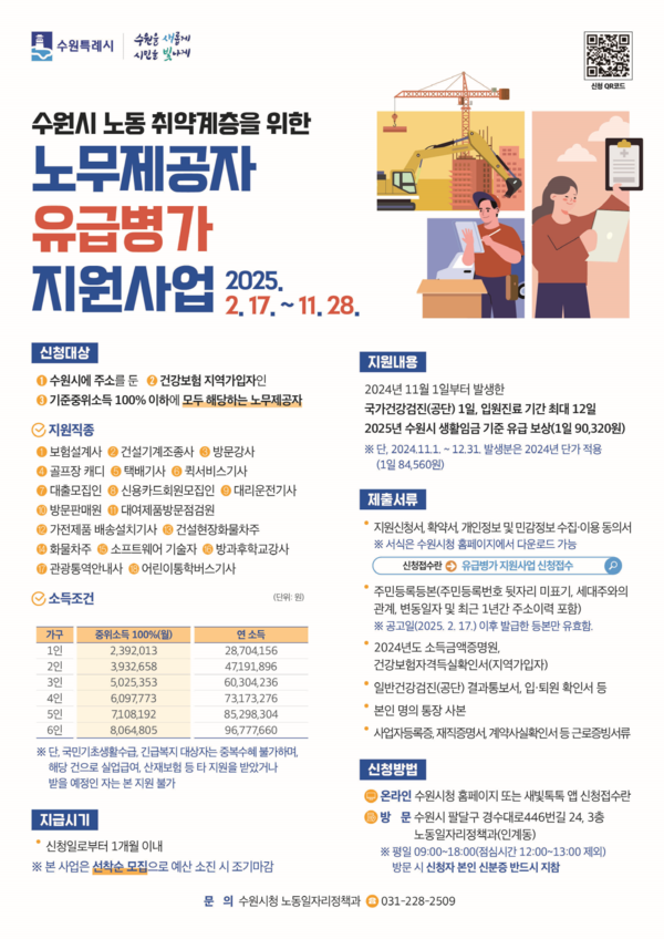 수원시는 11월 28일까지 ‘2025년 수원시 노동취약계층 노무제공자 유급병가 지원사업’ 신청을 받는다.