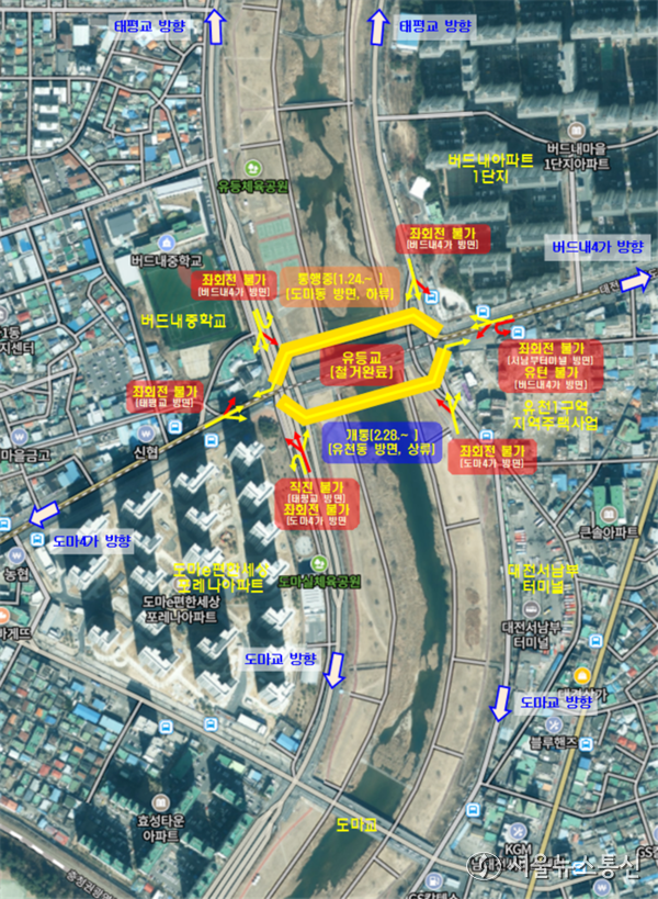 【대전·충남 = 서울뉴스통신】 조윤찬 기자 = 대전시는 지난해 7월 집중호우로 인해 교각이 침하되며 통행이 금지된 유등교를 대체할 가설교량을 오는 28일부터 양방향(도마동·유천동 방면) 6차로(편도 3차로)로 전면 개통한다. 이는 1월 도마동 방향 가설교량부분 개통에 이은 조치로 계백로의 교통 정체를 완화하고 시민들의 이동 편의를 높이는데 크게 기여할 전망이다.