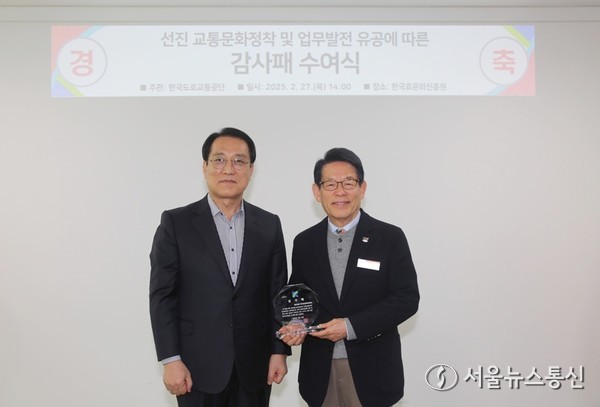 【대전·충남 = 서울뉴스통신】 조윤찬 기자 = 한국효문화진흥원이 27일 한국도로교통공단으로부터 선진교통문화 정착과 공단 업무 발전에 기여한 공로를 인정 받아 감사패를 받았다.