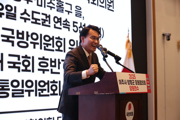 【서울 = 서울뉴스통신】 이민희 기자 = ‘2025 여주시·양평군 당원협의회 당원연수’가 25일 오후 2시 경기 여주시 남한강썬밸리호텔 2층에서 개최됐다. 여주시·양평군 당협위원장인 김선교 의원(21·22대 의원)이 먼저 축사를 했고, 이어 윤상현 의원이 ‘이번 사태의 본질은 체제수호 전쟁이다’주제 강의를 열띤 박수와 함께 이어갔다. 윤희숙 여의도 연구원장의 ‘대한민국 새판짜기’ 강의도 이어졌다. 500여명이 넘는 양평·여주 국민의힘 당원이 모여 “윤 대통령 탄핵을 기각하라, 각하하라” “지켜내자 윤석열” “지켜내자 김선교” 등을 외쳤다. 2025.03.25. snakorea.rc@gmail.com 사진 신현성 기자