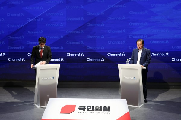 홍 후보는 이날 오후 서울 종로구 채널A 스튜디오에서 열린 2차 경선 '일대일 맞수 토론회'에서 "제가 당 대표였으면 계엄과 탄핵이 일어나지도 않았다"고 저격했다. 반면 한 후보는 "홍 후보처럼 대통령 옆에서 아부했던 사람들이 책임이 있다"고 받아쳤다.