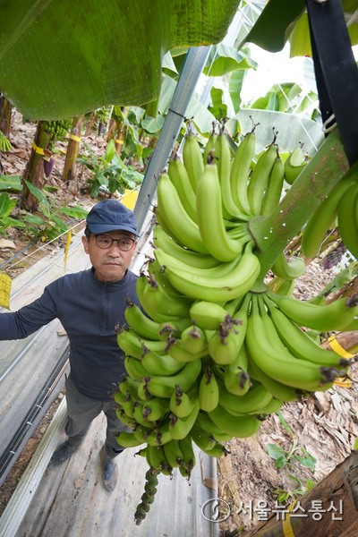 【광주·전남 = 서울뉴스통신】 김재희 기자 = 5~6m까지 키가 큰 바나나 나무가 줄지어 들어선 높다란 비닐하우스가 아열대 지역의 우림 못지않은 색다른 풍경을 자아낸다. 나무마다 주렁주렁 매달린 바나나가 이국적인 이곳은 해남의 바나나 농장.
