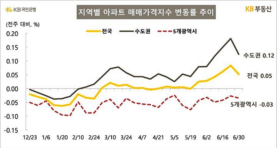 3일 KB부동산이 발표한 주간 아파트 시장 동향에 따르면, 6월 30일 기준 전국 아파트 매매가격 변동률은 전주 대비 0.05%, 수도권은 0.12% 상승했다. 전국은 6주 연속 상승세를 이어갔으며, 수도권 역시 상승 기조를 유지하고 있다.
