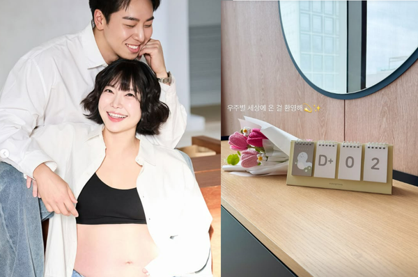 사진 속엔 'D+02'라는 문구가 적힌 달력이 놓여 있었다. 아기의 탄생을 축하하는 꽃다발 장식이 눈길을 끈다.