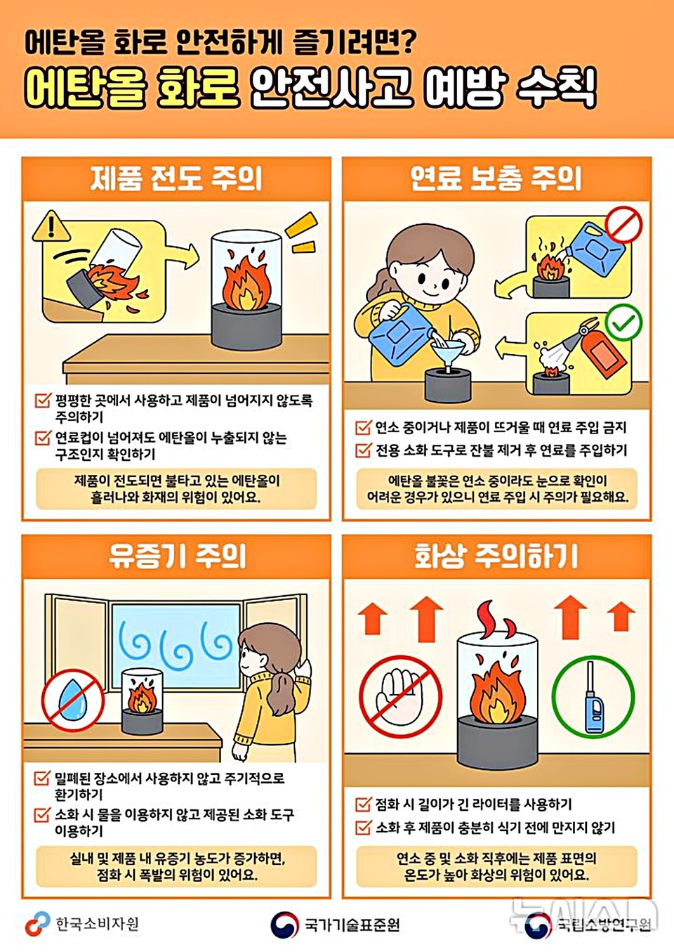 그러나 소비자위해감시시스템과 소방청 통계에 따르면 최근 3년간(2022년~2025년 6월) 휴대용 에탄올 화로 사용으로 인한 화재 사고가 40건, 부상자가 12명 발생한 것으로 집계됐다. 사용자가 불꽃이 꺼진 것으로 착각하고 연료를 주입하다가 남은 불씨에 불이 붙거나, 제품이 쓰러지면서 유출된 연료에 화재가 발생하는 사례가 대표적이다.