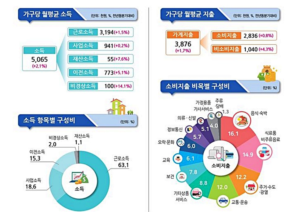 처분가능소득은 402만4000원으로 1.5% 증가했으나, 소비가 위축되면서 가계 흑자액은 118만8000원으로 3.3% 늘었다. 그러나 평균소비성향은 70.5%로 전년 대비 0.5%포인트 하락하며 4분기 연속 감소세를 보였다.