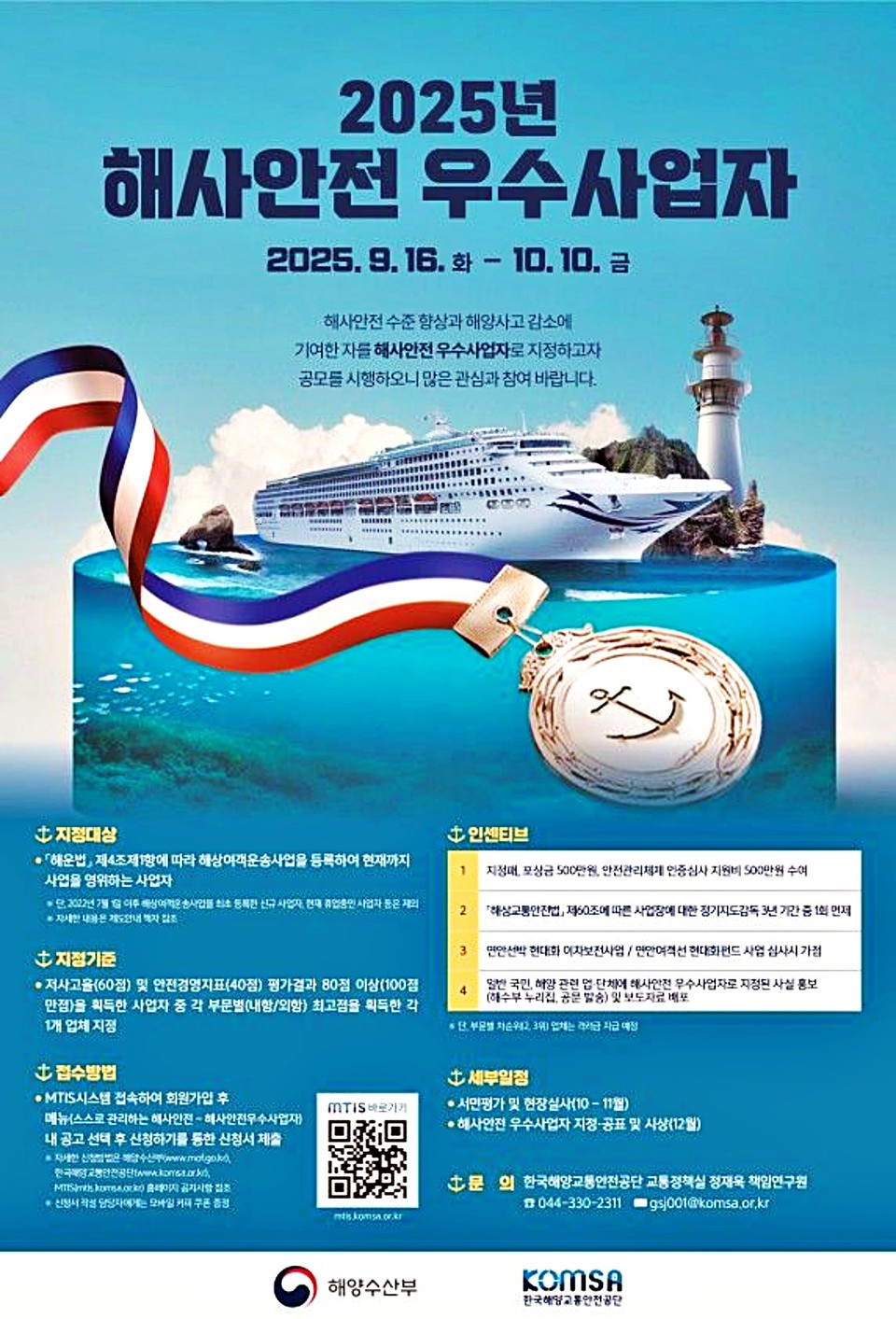 【서울 = 서울뉴스통신】 최정인 기자 = 해양수산부가 해상 여객선사의 안전 경영 문화 확산을 위해 ‘2025년 해사안전 우수 사업자’ 공모를 실시한다. 해수부는 15일 “오는 16일부터 내달 10일까지 해상여객운송사업자를 대상으로 공모를 진행한다”고 밝혔다.