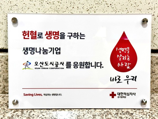 【경기·남부 = 서울뉴스통신】 김인종 기자 = 오산도시공사(사장 배명곤)는 지난 25일 대한적십자사 경기혈액원으로부터 ‘생명나눔기업’으로 선정되어 현판식을 진행했다고 밝혔다.