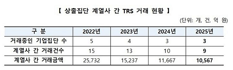 공정위는 계열사 간 파생상품 거래를 통한 ‘채무보증 우회 행위’ 가능성도 점검 중이다. 올해 7월 기준 총수익스와프(TRS) 거래 규모는 1조567억 원으로, 지난해(1조1687억 원)보다 9.4% 감소했다.