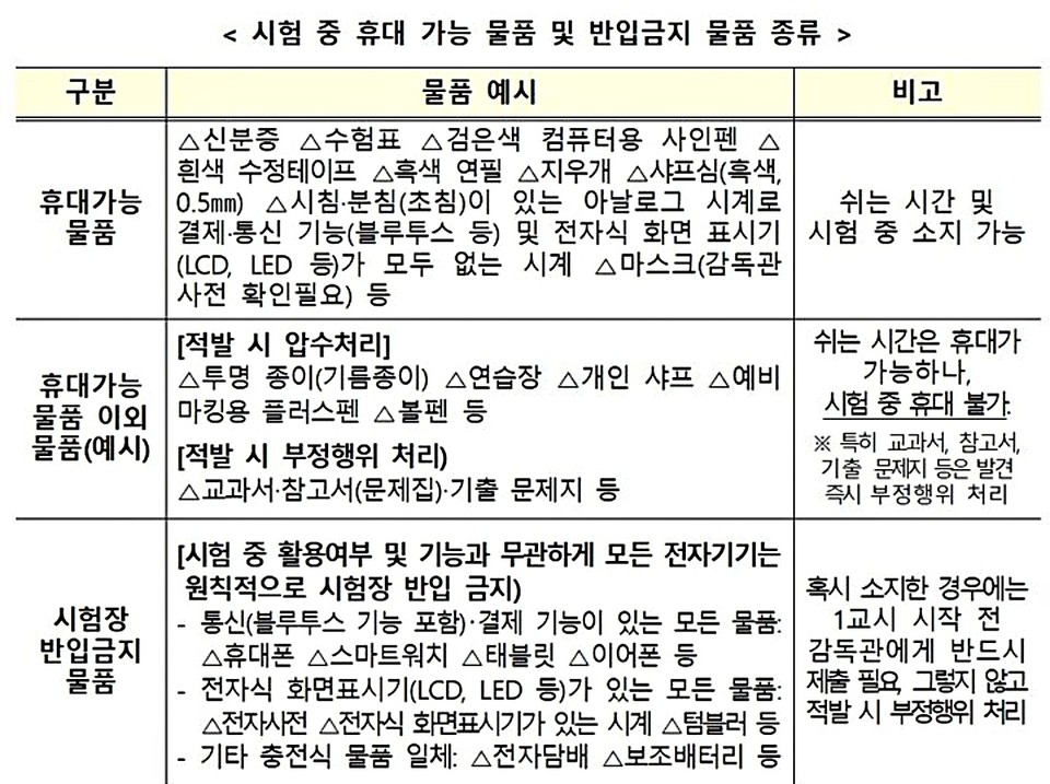 또한 보청기·돋보기·연속혈당측정기 등 의료상 필요 물품은 매 교시 감독관의 사전 점검 후 휴대할 수 있다.