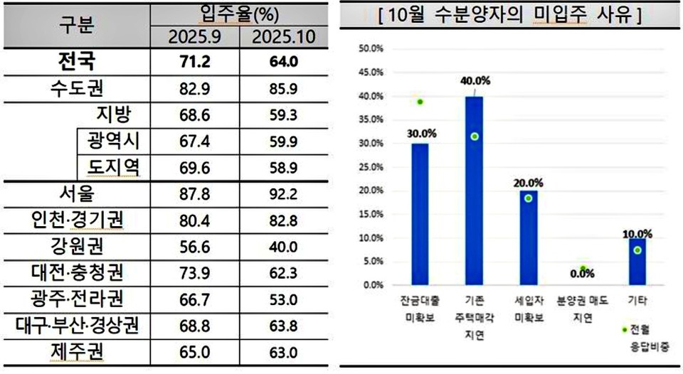 주택산업연구원 관계자는 “거래 침체와 대출 규제 강화가 맞물리면서 입주율 하락세가 당분간 이어질 것”이라며 “특히 미분양 증가와 기존 주택 매각 지연이 겹칠 경우 입주시장 위축이 더 심화될 가능성이 있다”고 전망했다.