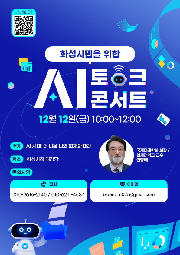 이번 특강은 AI 기술이 일상 전반에 빠르게 확산되는 시대에 발맞춰 시민이 직접 인공지능 체험하며 배우는 실용형 교육으로, 자영업자, 재취업 준비자, 경력단절 여성, 은퇴자, 직장인, 학생 등 화성특례시민이라면 누구나 참여할 수 있다.
