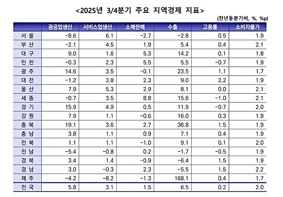 3분기 광공업 생산은 전년 대비 △5.8% 증가했으며 10개 시도에서 증가세가 나타났다. 충북(△19.1%), 경기(△15.9%), 광주(△14.6%)는 반도체·전자부품·전기장비 생산 확대로 상위권을 차지했다. 반대로 서울(△-8.6%), 전남(△-5.4%), 제주(△-4.2%)는 기타 제조업 및 전기·가스업 부진으로 감소했다.