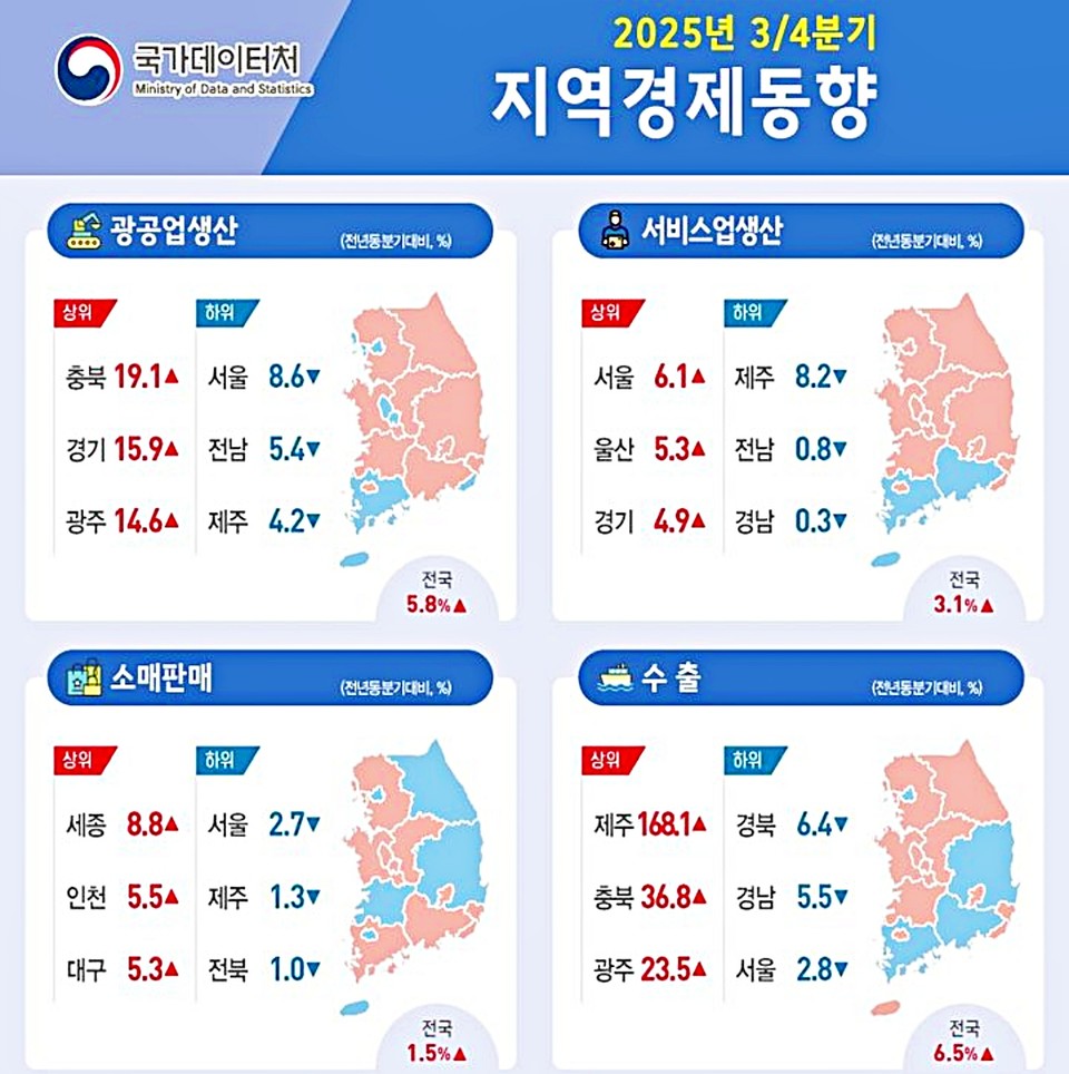 수출은 전년 동기 대비 △6.5% 증가했다. 제주(△168.1%), 충북(△36.8%), 광주(△23.5%)는 반도체·부품, 메모리 반도체 수출 확대로 상위권에 올랐고, 경북(△-6.4%), 경남(△-5.5%), 서울(△-2.8%)은 기계·방송기기·자동차 부품 수출 감소로 하락했다.