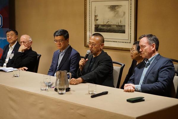 (사진=신화통신 제공) 【서울 = 신화/서울뉴스통신】 권나영 기자 = 16일 '중·미 민중대화 2025' 행사 현장에서 중국 유명배우이자 영화감독인 장원(姜文·왼쪽 셋째)이 발언하고 있다. '중·미 민중대화 2025' 행사가 이날 미국 캘리포니아주 로스앤젤레스에 위치한 헌팅턴 도서관, 미술관, 식물원에서 열렸다. 참석자들은 안정적인 양국 관계를 구축하는 데 있어 인문 교류가 중요한 역할을 한다고 강조했다.