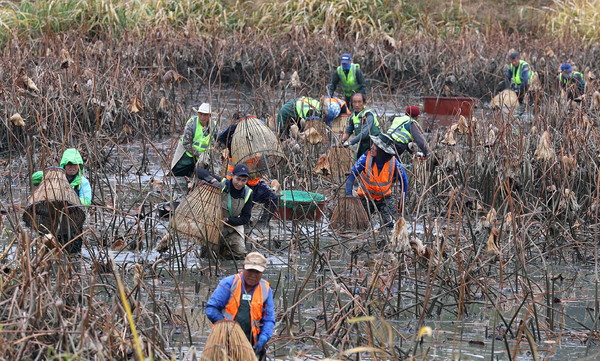 【광주·전남 = 서울뉴스통신】 김종원 기자 =19일 오전 전남 강진군 병영면 중고저수지에서 주민들이 대나무를 줄로 엮어 만든 원통형 바구니인 ‘가래’로 물고기를 잡고 있다.