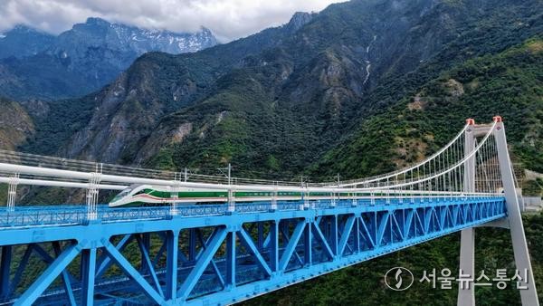 (사진=신화통신 제공) 【서울 = 신화/서울뉴스통신】 권나영 기자 = 지난 21일 후탸오샤(虎跳峽) 진사(金沙)강 철도 대교를 드론에 담았다. 윈난(雲南)성 쿤밍(昆明)시와 시짱(西藏)자치구 라싸(拉薩)시를 연결하는 뎬짱(滇藏)철도의 중요 부분인 리장(麗江)~샹거리라(香格里拉) 철도가 개통 2주년을 맞이했다. 개통 2년간 리샹(麗香)철도의 승객∙화물 운송의 양과 질은 모두 향상됐다.