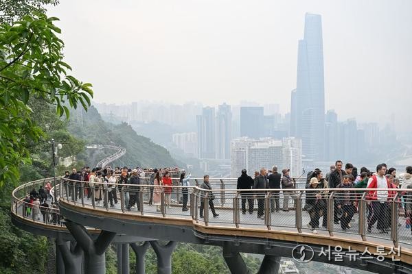 (사진=신화통신 제공) 【서울 = 신화/서울뉴스통신】 권나영 기자 = 24일 충칭(重慶)시 어링(鵝嶺)잔교를 건너는 관광객. 어링잔교가 정식으로 개방됐다. 총 길이 460m, 너비 3m, 최대 높이 지상 28m인 어링잔교는 자연 절벽을 따라 만들어져 탁 트인 강변 전망을 자랑하며 충칭 관광의 새로운 랜드마크가 됐다.