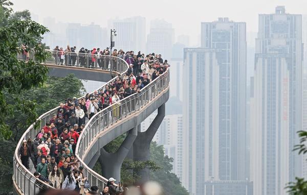 (사진=신화통신 제공) 【서울 = 신화/서울뉴스통신】 권나영 기자 = 충칭(重慶)시 어링(鵝嶺)잔교가 정식으로 개방됐다. 총 길이 460m, 너비 3m, 최대 높이 지상 28m인 어링잔교는 자연 절벽을 따라 만들어져 탁 트인 강변 전망을 자랑하며 충칭 관광의 새로운 랜드마크가 됐다. 24일 관광객들로 북적이는 어링잔교.