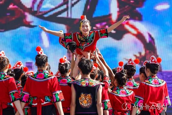(사진=신화통신 제공) 【서울 = 신화/서울뉴스통신】 권나영 기자 = 25일 윈난(雲南)성 쿤밍(昆明)시 루취안(祿勸) 이(彝)족먀오(苗)족자치현 성립 40주년 경축대회 현장에서 배우들이 공연을 펼치고 있다. 이날 루취안 이족먀오족자치현 성립 40주년 경축대회가 루취안현 경기장에서 열렸다.